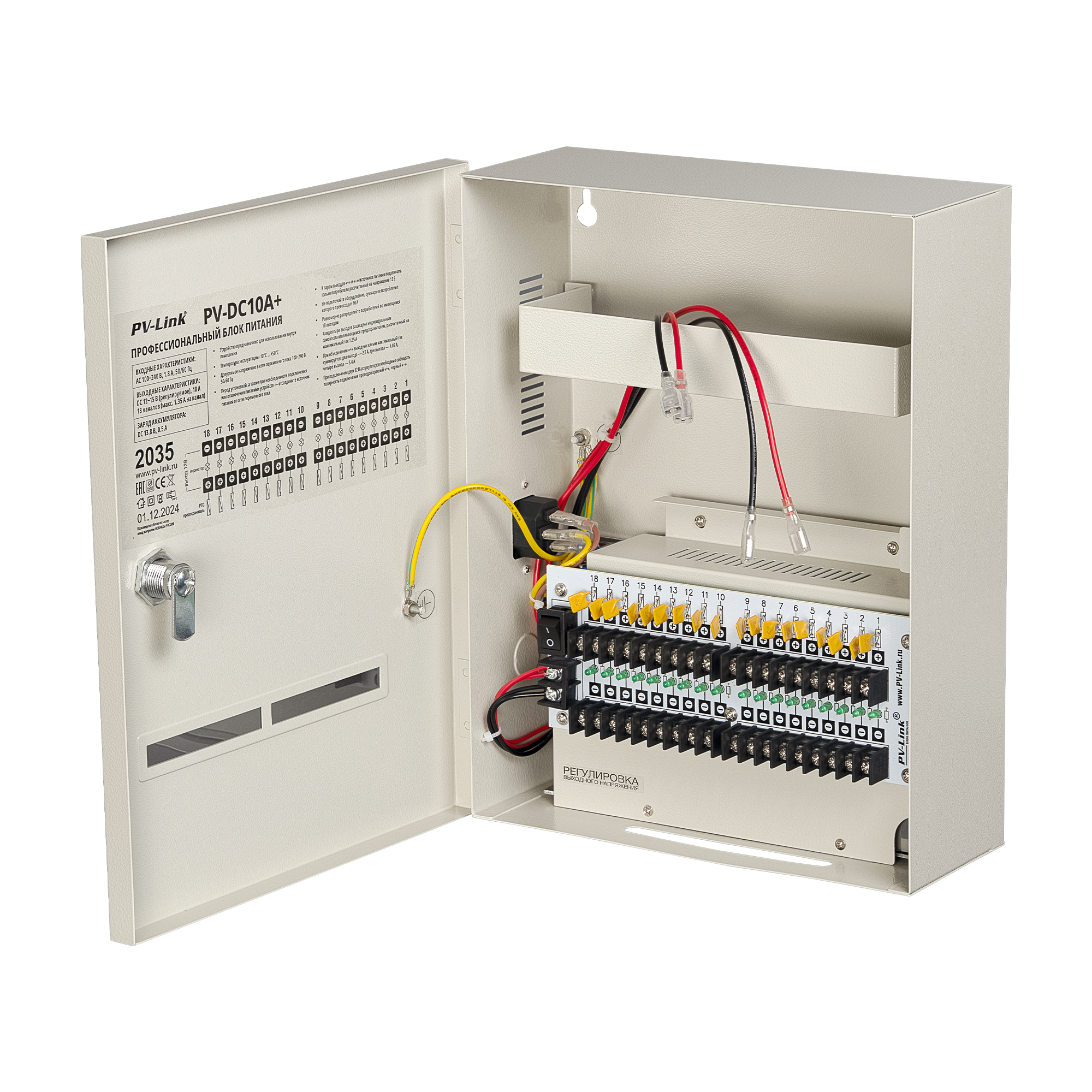 PV-link представляет линейку профессиональных источников бесперебойного питания 12 В. Модель PV-DC10A+, создана на основе высоконадежных элементов. Блок питания PV-link легко и удобно монтировать благодаря продуманной конструкции. Все элементы размещены в металлическом корпусе, закрывающемся на замок. Предусмотренный отсек позволяет установить два аккумулятора емкостью 7 А*ч для резервного питания прямо внутрь корпуса. Аккумулятор подключается через отдельные контакты и заряжается при наличии напряжения в сети 220 В. PV-DC10A+ может обеспечить питание систем видеонаблюдения (CCTV), светодиодных лент, Wi-Fi роутеров, СКУД и других устройств с общим током потребления не более 10 А. Имеет девять независимых выходов защищенных индивидуальными самовосстанавливающимися предохранителями, которые обеспечивают работоспособность системы даже в случае выхода из строя каких-либо из подключенных устройств или повреждения части коммутационных линий. Незаменим при построении любых охранных систем.Основные особенности18 независимых выходов со светодиодной индикацией рабочего состояния (максимальный ток каждого выхода до 1,35 А)18 независимых индивидуальных самовосстанавливающихся предохранителейВозможность установки и зарядки двух аккумуляторов для резервного питанияЗащита от глубокой разрядки аккумуляторовЗащита от перегрузок по напряжению и по токуЗащита от короткого замыканияРегулировка выходного напряжения в диапазоне от 12 до 14 В для компенсации потерь в кабелеМеталлический корпус, закрывающийся на замок