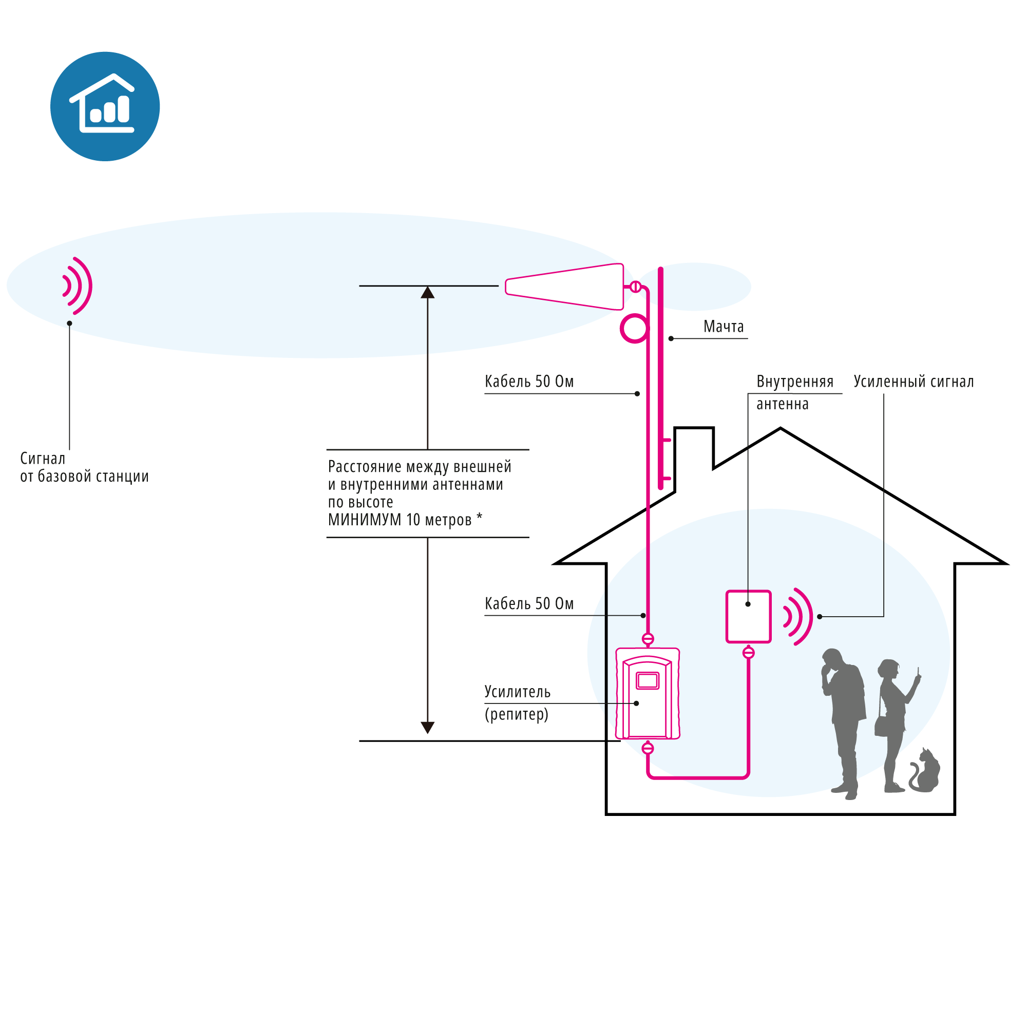 В состав комплекта входит оборудование для покрытия площади покрытия сигналом 100-200 м2 (в зависимости от конструктивных особенностей помещения). При необходимости, площадь покрытия можно расширить с помощью дополнительных внутренних антенн