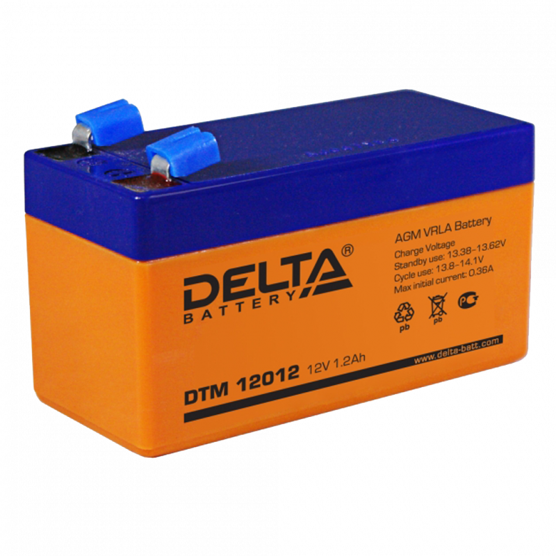Аккумулятор DTM 12012, Delta, герметичный свинцово-кислотный (Оранжевый), Емкость аккумулятора: 1,2 Ач, Номинальное напряжение: 12 В, Хранение: -35…+60°С, Заряд: -10…+60°С, Разряд: -20…+60°С, Размеры: 97х43х58 мм