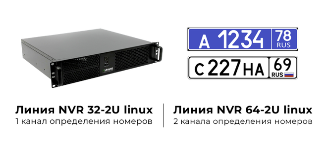«Линия NVR 32-2U Linux» рассчитан на задействование одного канала, а «Линия NVR 64-2U Linux» на два канала для определения автомобильных номеров.