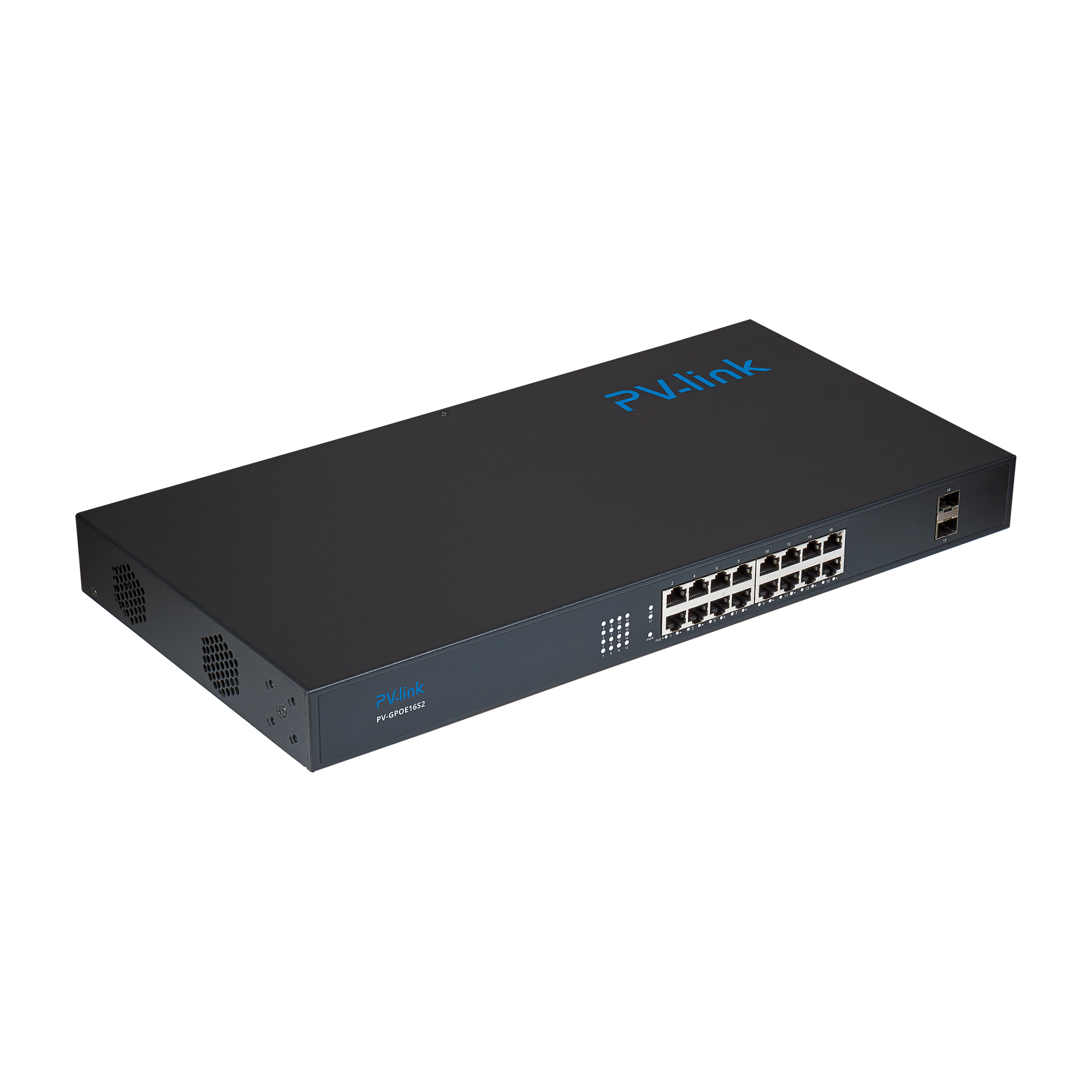 PV-GPOE16S2 это 18 портовый коммутатор 10/100/1000 Мбит/с с 16 портами PoE и 2 up-link портами с интерфейсами SFP, производства компании PV-Link. Предназначен для объединения потоков данных с сетевых IP устройств и питания.
