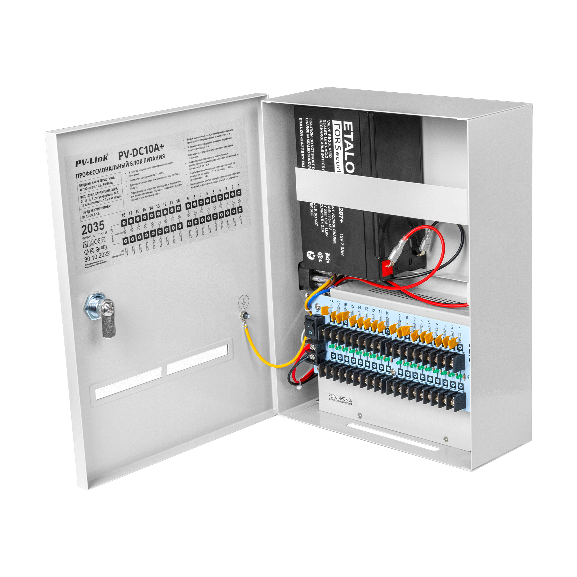 PV-Link представляет линейку профессиональных источников бесперебойного питания 12 В. Модель PV-DC10A+, создана на основе высоконадежных элементов. Блок питания PV-Link легко и удобно монтировать благодаря продуманной конструкции. Все элементы размещены в металлическом корпусе, закрывающемся на замок. Предусмотренный отсек позволяет установить два аккумулятора емкостью 7 А*ч для резервного питания прямо внутрь корпуса. Аккумулятор подключается через отдельные контакты и заряжается при наличии напряжения в сети 220 В. PV-DC10A+ может обеспечить питание систем видеонаблюдения (CCTV), светодиодных лент, Wi-Fi роутеров, СКУД и других устройств с общим током потребления не более 10 А. Имеет девять независимых выходов защищенных индивидуальными самовосстанавливающимися предохранителями, которые обеспечивают работоспособность системы даже в случае выхода из строя каких-либо из подключенных устройств или повреждения части коммутационных линий. Незаменим при построении любых охранных систем.Основные особенности18 независимых выходов со светодиодной индикацией рабочего состояния (максимальный ток каждого выхода до 1,35 А) 18 независимых индивидуальных самовосстанавливающихся предохранителей Возможность установки и зарядки двух аккумуляторов для резервного питания Защита от глубокой разрядки аккумуляторов Защита от перегрузок по напряжению и по току Защита от короткого замыкания Регулировка выходного напряжения в диапазоне от 12 до 14 В для компенсации потерь в кабеле Металлический корпус, закрывающийся на замок