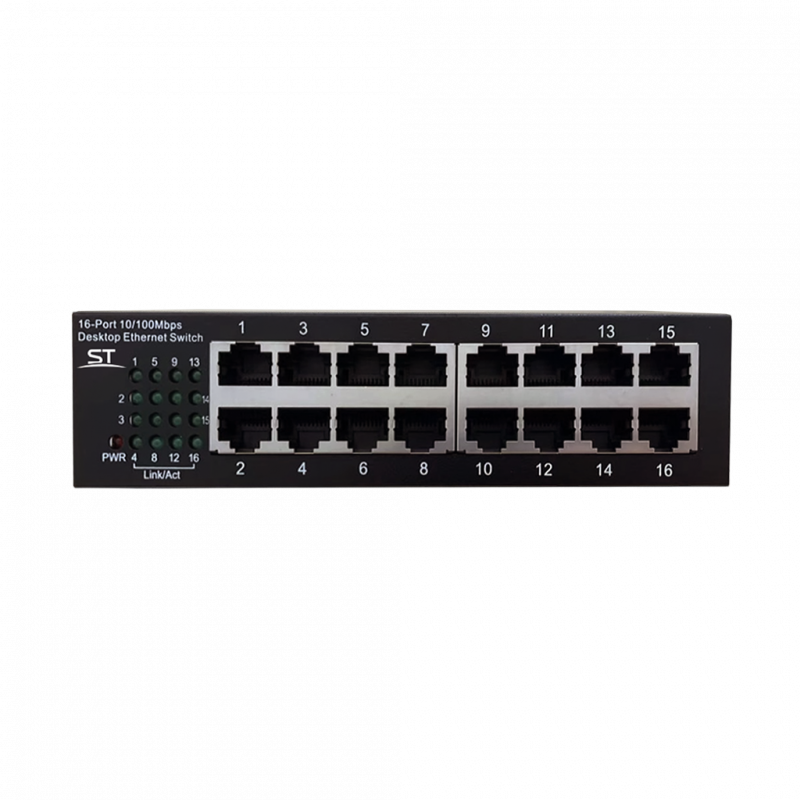 ST-ES161M, Cетевой 16-ти портовый коммутатор,обеспечивает подключение сетевых клиентов со скоростью до 100 Мб/с.Имеет широкий диапазон питающих напряжений - от 5 до 13 Вольт, что позволяет применять его для решения различных задач при организации систем видеонаблюдения, Ethernet порты: 16х (10/100Мбит/с), Max.пропускная сп-ть: 100 Мбит/канал, Uпит(В): 5...13В (±10%), Стандарт сети: IEEE802.3u,IEEE802.3x,IEEE802.3ab, Скорость фильтрации/передачи пакетов: 10BASE-TX:14880 пакетов в сек./порт,100BASE-TX:148800 пакетов в сек./порт, Коммутационная способность: 3,2Гбит/с, Металл, От 0°C до +40°C, 160х80х40 мм